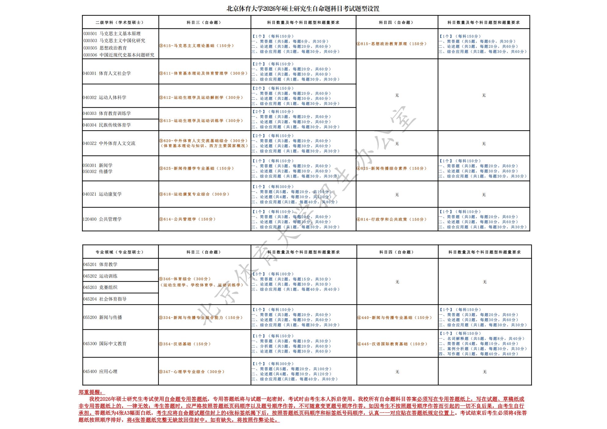 北京体育大学2026年硕士研究生自命题科目考试题型设置