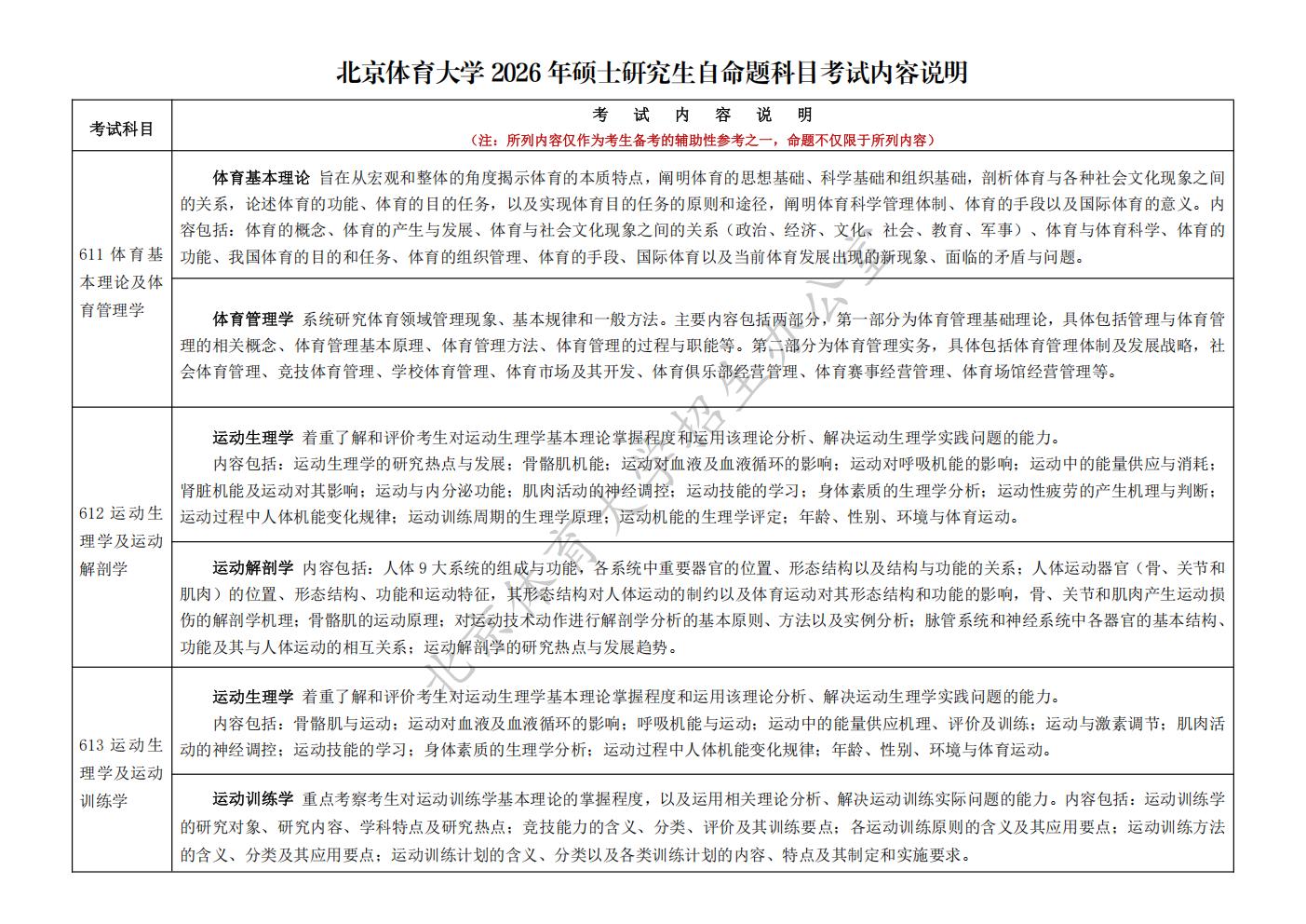 北京体育大学2026年硕士研究生自命题考试内容说明